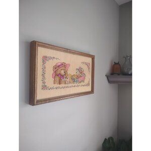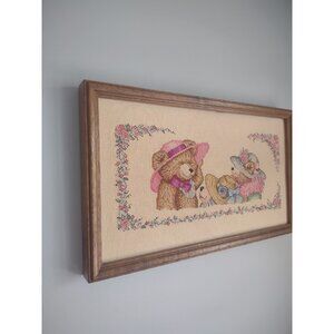 Vintage Finished Framed Cross Stitch Featuring Chatter Hat Bears Playing Dress Up in a Floral Theme. Wood Framed Wall Art Decor Hanging. No glass over the cross stitch.