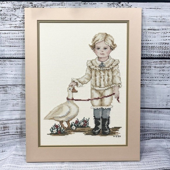 Vintage Finished Cross Stitch English Victorian Boy w/ Duck 1989 16x12" Nursery