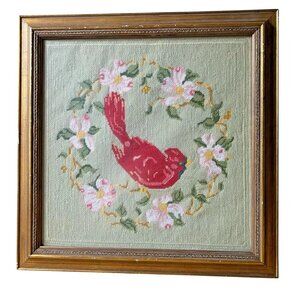 Vintage Finished Needlepoint Picture Cardinal Floral Gold Square Frame Artwork