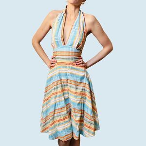 Vintage Finley Marilyn Halter Dress – Blue Orange Plaid – Size 10 – Open Back
