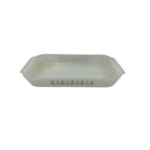 This Vintage Fire King Anchor Hocking Milk Glass Cake Pan features a charming MCM Mid Century, Candle Glow Pattern. Perfect for baking and displaying your favorite cakes in classic, retro style.
