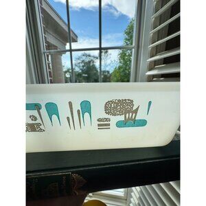 This mid-century Fire King loaf pan showcases the iconic Atomic Blue Heaven pattern, reflecting post-war modernist aesthetics. Its durable white glass construction and vibrant turquoise and brown design make it a charming collectible or functional vintage kitchenware.