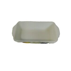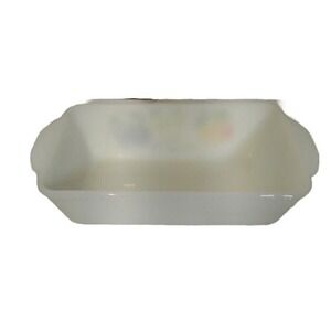 Vintage milk glass baking dish featuring a charming fruit design. This rectangular casserole pan is perfect for baking and serving your favorite dishes. The delightful fruit pattern adds a touch of vintage elegance to your kitchen. Ideal for everyday use or special occasions, this baking dish is a versatile addition to your cookware collection. Great for baking desserts, casseroles, or roasting vegetables, and perfect for family dinners or holiday gatherings.