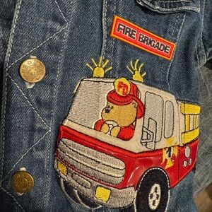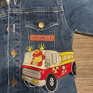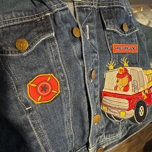 Adorable vintage-inspired toddler denim jacket with grey hood, size 24 months. Features charming embroidered fire truck and firefighter patches, including “Fire Brigade” design. Made with durable blue denim and soft hood lining for comfort. Unisex style perfect for boys or girls. Snap button front, chest pockets, and cuffed sleeves. Great for everyday wear, dress-up, or as a unique gift for little firetruck fans.