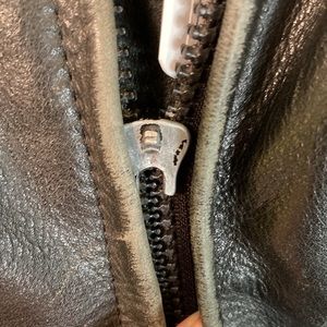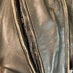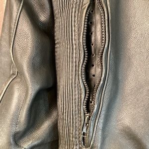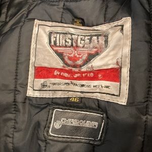 Vintage First Gear Hein Gericke Leather motorcycle jacket with forearm and shoulder armor. Toggle in front zipper is missing but works fine. Zip out shell. Front and back zip open ventilation. Zip off cushion collar. Adjustable Kidney protection. L101