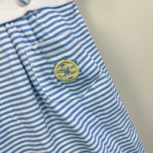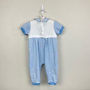 Vintage First Impressions Blue Stripe Sailor Outfit. Baby boy size 6-9 months. Soft one piece coverall outfit. Blue and white stripes with anchor, lighthouse, and dog in a sailboat on the chest. Embroidered ship wheel on the pocket, too! Collared with decorative buttons at the waist. Snaps in the back and along the legs. Excellent condition, likely new without tags (NWT).