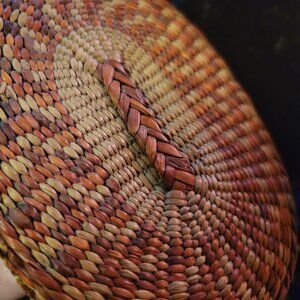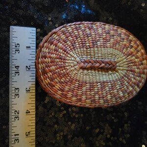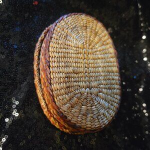 Vintage First Nations Native Fine Woven Lidded Basket. Lovely intricate hand woven small basket with a two color contrast design- GREAT Condition- and very well made. Vintage from the 1970s