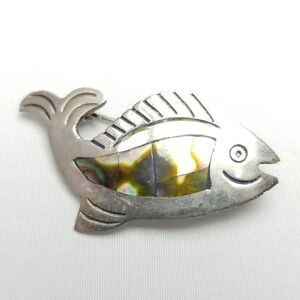 Vintage Fish Shape Brooch with Inlaid Mother of Pearl, Silver Tone Signed Mexico