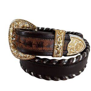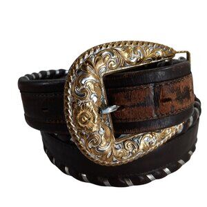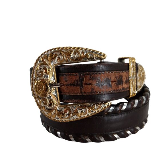 Vintage Fisher Brown Leather Backstitch Gold Silver Buckle Belt Size 34 Western