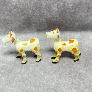 These vintage Fisher cow figure toys with orange spots. A classic collectible from Hong Kong's toy-making era.