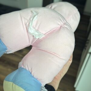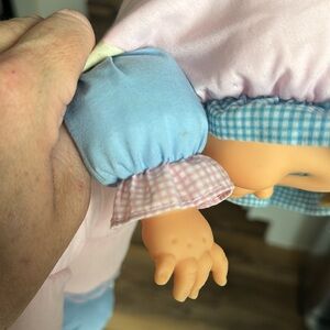 - has small stains on back of pants and one on arm- very light - This charming stuffed doll features a delightful combination of pink and blue colors, perfect for cuddling and playtime. Its soft and huggable design makes it a wonderful companion for kids.