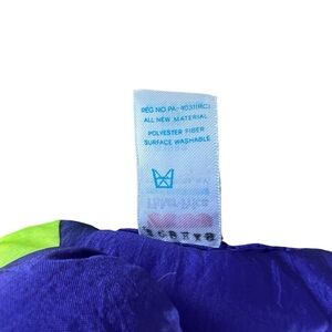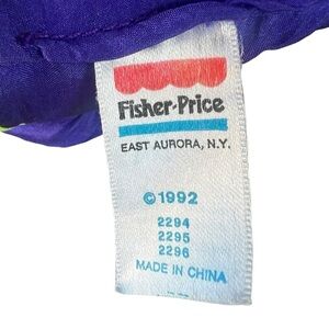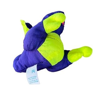Vintage Fisher-Price Puffalump Dino Roar Squeaky Plush Dino Toy. Bright Neon Purple, Pink & Yellow/Green, big eyes, Nylon windbreaker material with squishy interior. It has a loud squeak when you squeeze it. A blast from the past!! Dated 1992.