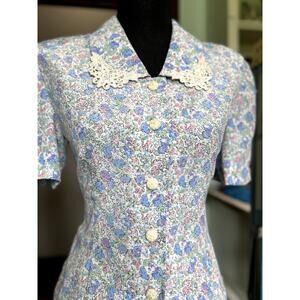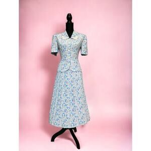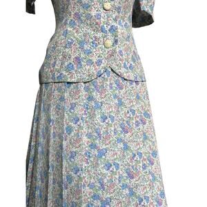 Vintage 1970's pleated skirt Leslie Fay two piece skirt and top. This sweet set is a floral pattern with pink, green, blue and purple on white. Lace applique on collar. The buttons on this top are a gorgeous pearl like button with tons of detail. The skirt has an elastic waistband and can be worn with or without a crinoline slip. The pictures are with a small crinoline slip underneath. The top is a button front with shoulder pads. This is a vintage 70's size 8 which is typically going to be a smaller modern size so please see measurements. The measurements are taken flat unless noted otherwise. This are approximate measurements but I take time to try and get as close as possible. 100% polyester , machine wash cold , gentle cycle, no bleach, iron low, tumble dry low. If outside of US message me for exact cost