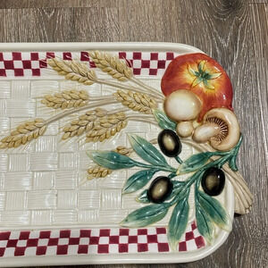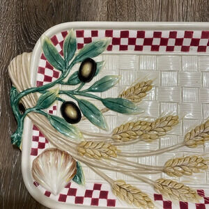Beautiful vintage Fitz and Floyd harvest basketweave platter, wheat, olive, vegetable decorations , in great condition no flaws,21” long 8 1/2” Wide