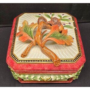 This is a very nice vintage Fitz & Floyd Classics Equestrian Collection octagon dish with a lid. Ceramic dish has acorn and leaf embellishments on top of the lid and a twig handle. It is preowned with some small chipping, mild paint wear and the tips of one of the leaves are broken. This can all be seen in photos, please review all photos closely as a part of the description. Approx 6" x 6" x 5.5" tall.