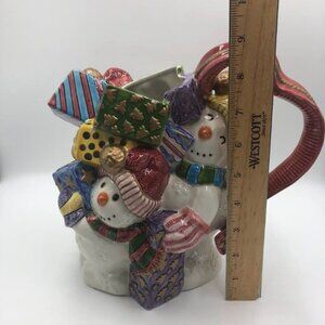 Vintage Fitz & Floyd Discontinued Snowman Christmas Ceramic Pitcher. Pitcher is vintage pre-owned. Please see all photos for visible condition. No original box. Based upon research is from 1995 and 1-1/5 quart - I did not measure so if you would like an actual measurement please message. Approximately 9 inches x 9 inches x 6 inches. No lid came with this pitcher. Felt feet not on bottom - uncertain if came with them although it looks like put on after purchase - please see bottom photo. No noticeable cracks. There is a paint discoloration on the handle - see photo and when I rubbed my fingers over it there felt like could be a tiny nick (not visible to eye or in photo) about the discolor spot but the actual discolor is not a nick or chip. Very nice collectible piece!