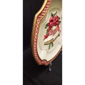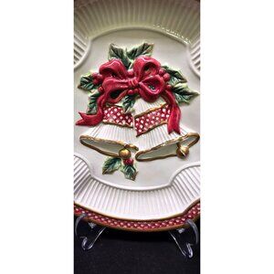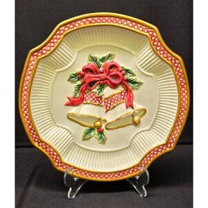 This is a collectible Fitz and Floyd Christmas serving plate featuring holiday bells. This plate has some signs of paint wear, especially around the edges as shown in photos. No chips or cracks noted. Please review photos as a part of the description. Approx. 9". Plate stand not included.