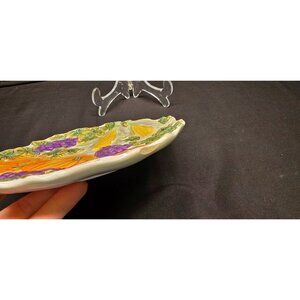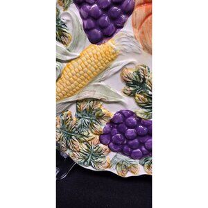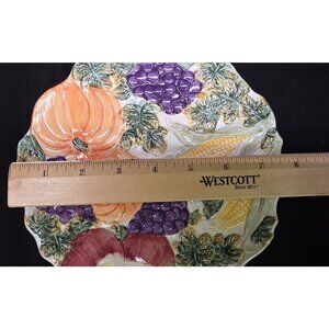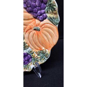 This is a vintage Fitz & Floyd OCI Harvest Bounty salad plate 1993. Hand Painted featuring an autumn motif with pumpkins, corn, grapes, and apples. There There is a chip on a leaf coming off of the ear of corn, there are a few areas with paint wear/chips, and there is one chip along the edge of the plate. All are shown in photos. Please review photos as a part of the description. Approx 7.5" wide. Plate stand not included.