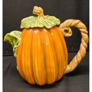 This is a discontinued Fitz & Floyd Halloween pumpkin ceramic teapot. Teapot shaped like a pumpkin with a vine-like handle and a lid shaped like leaves. Pot marked on bottom: OCI 1989 44oz Taiwan. Approx 9.5" tall. Preowned in good condition. Minor signs of wear. No chips or cracks noted. Please review photos as a part of the description.