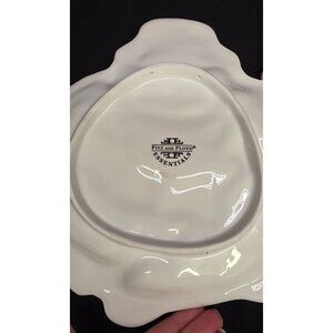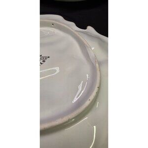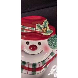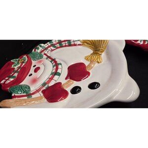 This is a set of 3 matching Fitz & Floyd Plaid Christmas Snowman Canape decorative serving plates. Featuring a snowman holding a broom, wearing plaid scarf. One plate has a chip on the bottom rim. All the plates have some paint wear and some superficial crazing. Plates do have holes on the back of plates for hanging if you chose. Approx 9" x 8". Please review all photos as a part of the description.