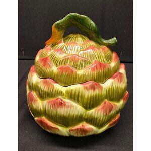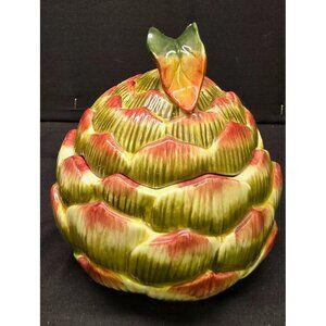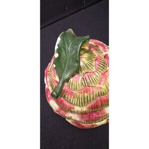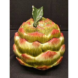 This is a vintage Fitz and Floyd artichoke shaped serving bowl with lid. The leaf on top has chipping and paint loss as can be seen in the photos. Approx 5" tall x 5" wide. Please review photos as a part of the description.