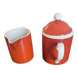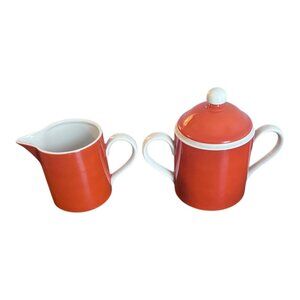 This Vintage Fitz and Floyd Terracotta Cream and Sugar Set is a beautifully crafted porcelain set in vibrant terracotta and orange tones, adding a charming, rustic touch to any table setting.
