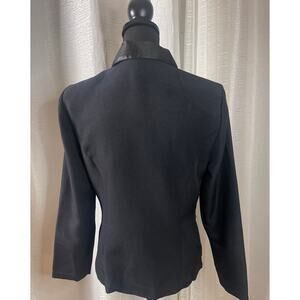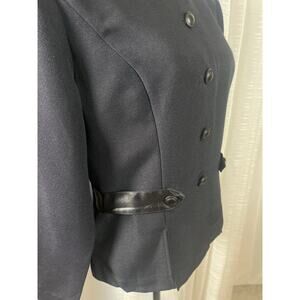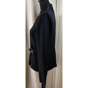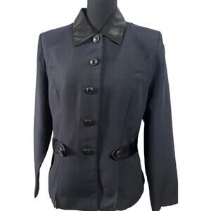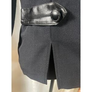 Vintage five button black five button blazer with front splits, faux leather collar spread collar and faux leather decorative side straps.