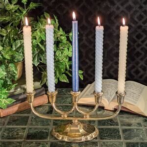 Vintage five-light silver plate Menorah candelabra that has many uses in both the Jewish and Kabbalah faiths. This elegant five-arm candelabra has a sleek design with an Art Deco feel that would complement many different aesthetics wonderfully. It has a lovely aged patina that only develops with time, but should be able to be polished if you desire to do so. However you choose to display it, this classically-styled Menorah is an elegant choice!