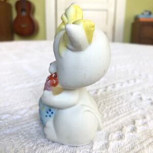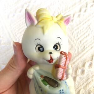 π Sweet little vintage porcelain cat figurine - white cat wearing yellow bow and holding a blue bag of gifts