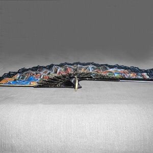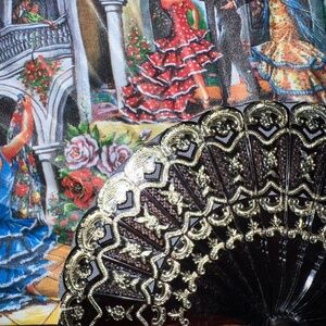 - Black, victorian style fan with colorful flamenco dancers and delicate lace border