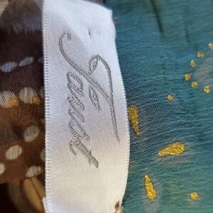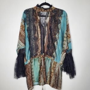 Faust Vintage Long Sleeve Sheer Tunic. Green, brown and tan with gold accents and lacy details. Size is approx. L/XL - See measurements for details. Made In France.