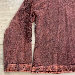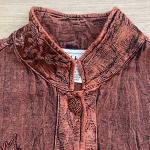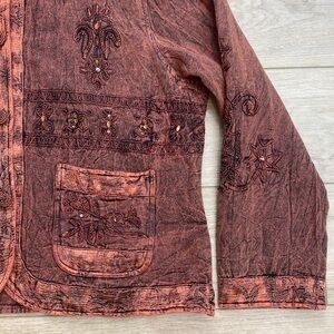 Vintage Coral Melon dyed acid wash artsy mandarin collar twill button front jacket by Flashback. The distressed wash is accented by a shimmer jacquard trim and cord applique embroidered flowers with sequin accents. a boho, new age lightweight jacket. in excellent condition. Women's size 1X