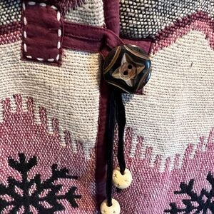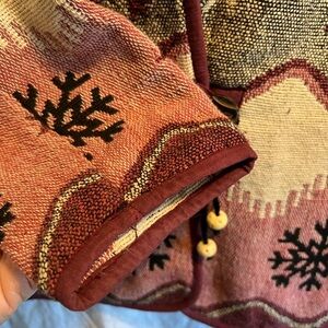 Like new tapestry blazer by Flashback. Vintage beauty. Snowflakes in cream, maroon, black and gray. One front bottom close. Pockets. Button with strings are very pretty accents. Size Medium. This is one for your collection.