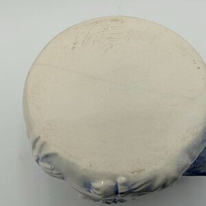 Vintage Flat Earth Pottery '92 Coffee Mug featuring a 3D Angel with Wings in Cobalt Blue. This round mug is made of clay and ceramic, with a glossy finish. It is handmade and signed by the artist. The mug is from the 1990s and was manufactured in the United States. It is 4 inches in diameter and height, weighing 9 ounces. It is recommended to hand wash this unique art pottery mug.