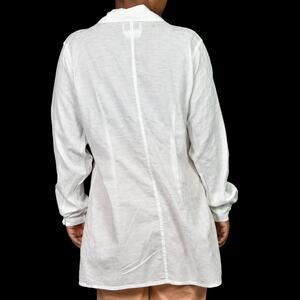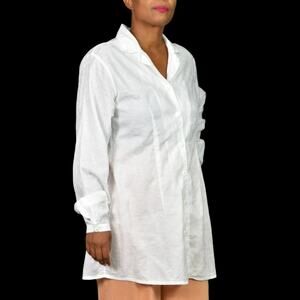 Vintage FLAX by Jeanne Engelhart tunic shirt FEATURES a classic button down silhouette with a long thigh length. Textured jacquard fabric. Loose, relaxed fit. Long sleeve with button cuffs. Lagenlook style.