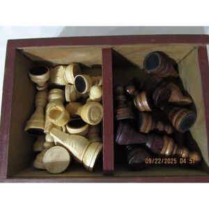 Vintage Fleur-de-lis wooden box chess set with wooden pieces slide top box