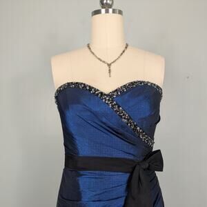 Vintage strapless drop waist prom dress maxi gow from Flirt Maggie Sottero, size 10. Blue black colorshift polka dot satin with black bow and accents. Beaded and sequin embellishments. Tiered ruffle mermaid skirt. Sweep train. Ideal for Y2K, princess, glam, Hollywood red carpet, and movie star vibes.