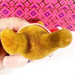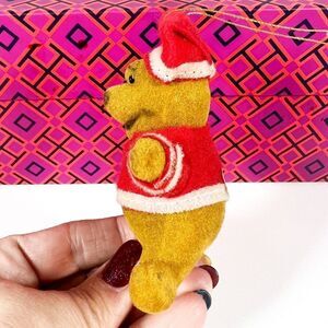 Vintage Flocked Christmas Winnie the Pooh by Walt Disney Productions Hong Kong. This is Winnie the Pooh with his Santa hat. This does have some small marks on the side, see pictures. This is about 3.5” tall.