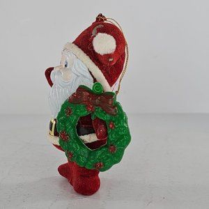 Vintage Flocked Santa Claus Holding Wreath Ornament Christmas Hong Kong