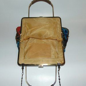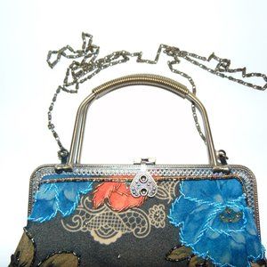 Floral handbag with decorative beads has metal top and ring style handles there is a chain attachment for over the shoulder. The top is metal and it latches closed when you push it together, to open flip the metal heart and it unlatches. Not sure what the outside fabric is made of, it is light weight and very soft. I have found a few small loose strings on the outside. The inside lining is very clean no found rips or tears. It is much larger than most of the vintage bags this one measures 9 inches tall not including handles and 11 inches wide at the bottom.