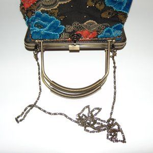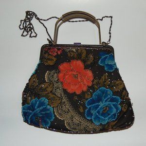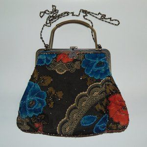 Vintage Floral Beaded Handbag with Metal Top Latch Closure and Chain Strap