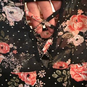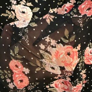 Elegant women's top featuring a vibrant floral design. The black base is beautifully contrasted with pink flowers, making it perfect for any occasion.
