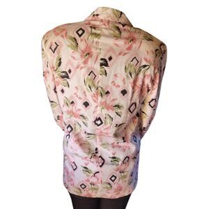 Chic floral blazer with a classic fit. Features pink flowers and black geometric accents. Perfect for a stylish look.