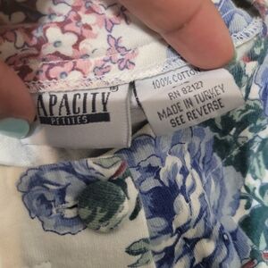 Charming floral Romper with short sleeves. Features a mix of blue and pink flowers on a cream background.