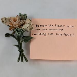 Condition: Bottom blue flower is loose but not detached. Missing two side flowers. Visible glue residue and repair on the back. Some discoloration and wear on flowers.