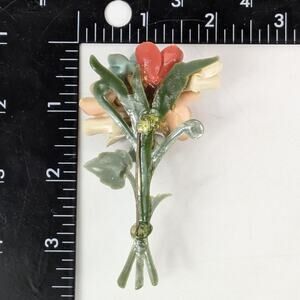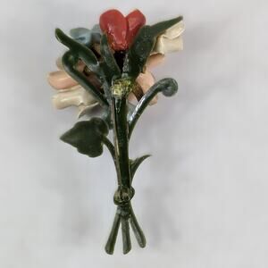 Title: Vintage Floral Bouquet Brooch Porcelain Resin Flower Pin Green Peach Red Blue