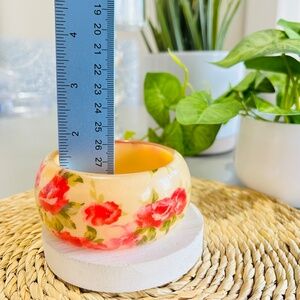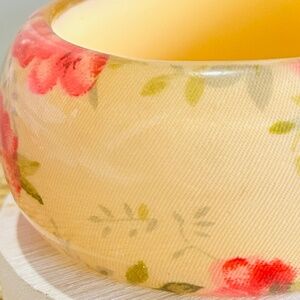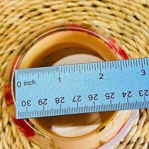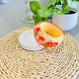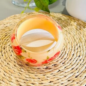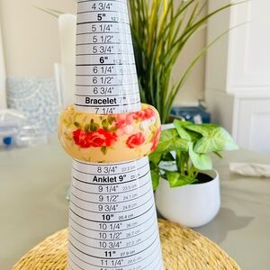 Charming vintage bracelet. Features vibrant red floral design. Cream background enhances elegance. Perfect for any occasion.