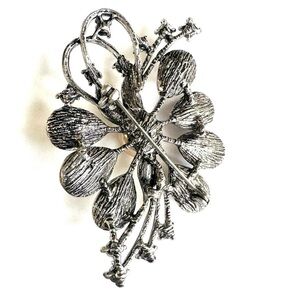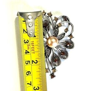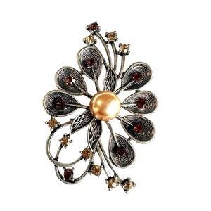 Antiqued silver tone floral shaped brooch with amber and champagne colored rhinestones. Rose gold faux pearl center.