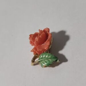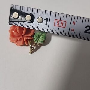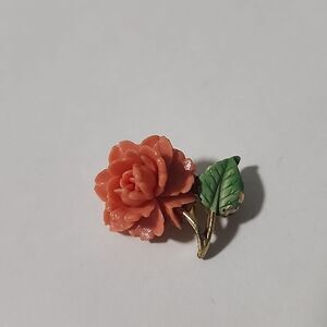 This exquisite floral brooch features a stunning coral flower paired with a delicate green leaf. Perfect for adding a touch of elegance to any outfit.