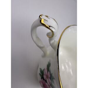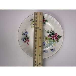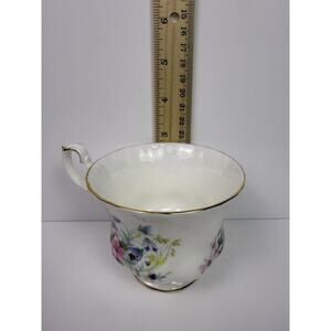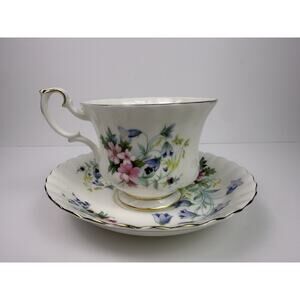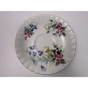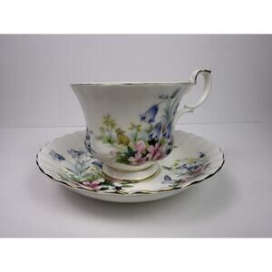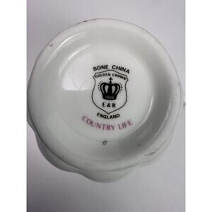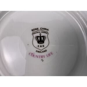 Add timeless elegance to your collection with this beautiful vintage E&R Golden Crown Bone China teacup and saucer set, made in England. The pattern is called “Country Life” and features vibrant hand-painted style florals in shades of pink, blue, yellow, and purple, with delicate green foliage. A small bunny adds a charming countryside touch.